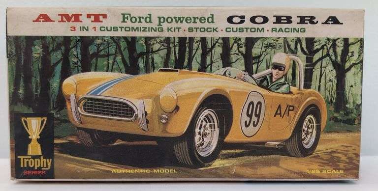 This listing is for an AMT Ford Powered Cobra 3 in 1 Customizing Kit 2170-150. This model car allows you to build a stock, custom, or racing version. Kit is un-assembled open box with all parts being off sprue. Kit appears complete and includes white walls and instructions. Box is bright, clean, square and solid with little wear.