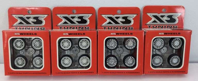 This lot includes four sets of XS Tuning 1:24 scale model car wheels that include tires and rims. Styles include C2 Sport with white 17-10006 and aluminum finish 17-10005, and Street S17 with chrome 17-10007 and aluminum finish 17-10008. Kits are Mint, packages show no wear.