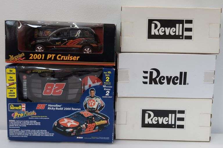 This lot includes a Meguiar's 2001 PT Cruiser (1:25 scale) 85-0936, a Revell Pro Finish 28 Havoline Ricky Rudd 2000 Taurus (1:24 scale) 85-1651, 2003 Corvette Convertible 85-0947 Promo Model, 2003 Corvette Coupe 85-0946 Promo Model and Chevy Impala Highway Patrol 85-0970 (NY, NJ, VA) Promo Model. Cars appear to have never been played with or displayed. 85-1651 is un-assembled. Boxes show little to no wear, bright, clean, square and solid.