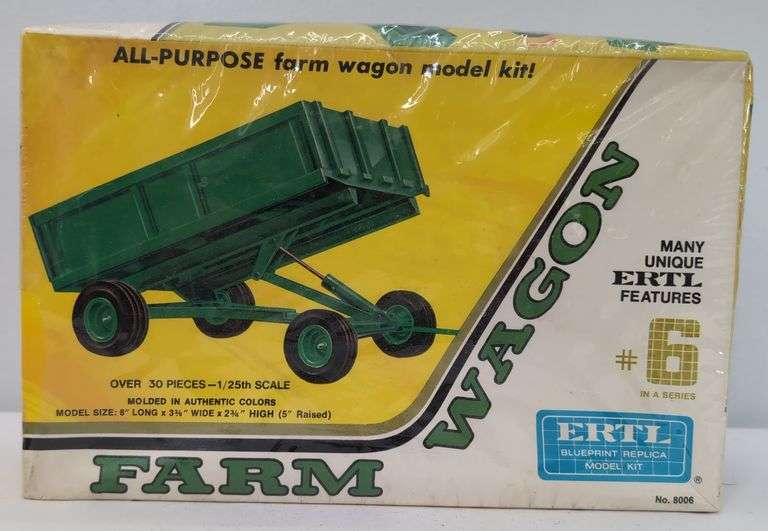 Ertl Blueprint Replica Farm Wagon Model Kit #8006. Sealed in original packaging. 1/25th Scale, Over 30 Pieces. Overwrap has small tear at top edge of an end panel.