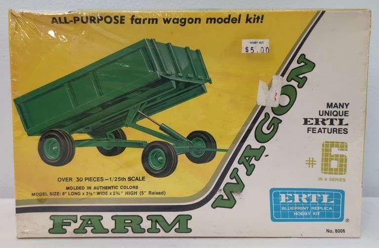 All-purpose farm wagon model kit by Ertl. This is a blueprint replica hobby kit numbered 8006. This is a 1/25 scale model. Over 30 pieces. The model size is 8" long x 3 1/2" wide x 2 3/4" high. Kit is Mint, factory sealed with un-torn cellophane overwrap, price stickers.