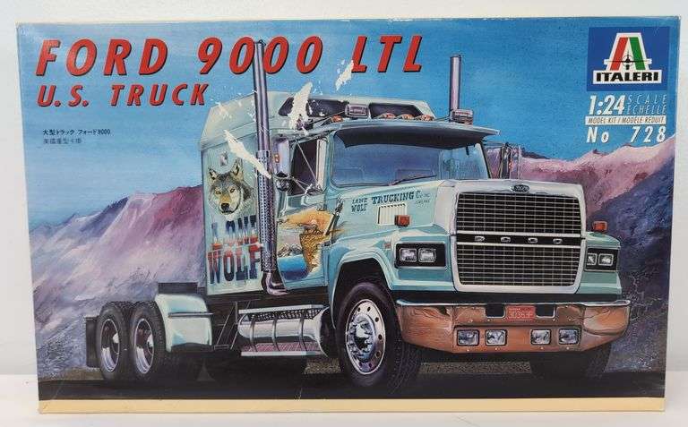 Italeri Ford 9000 LTL U.S. Truck 1:24 Scale Model Kit #728, unassembled open box kit appearing complete containing parts on sprue, loose parts, instructions, decals, etc. Box shows little wear, bright, square and solid.