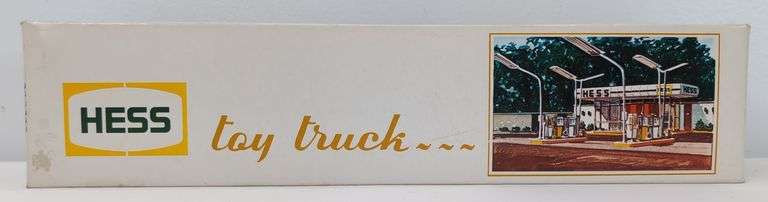 1976 Amerada Hess Corporation Fuel Oil Gasoline truck and trailer with three green oil drums/barrels with Hess labels, made in Hong Kong. Truck appears to have never had a battery installed, been played with or displayed. Original inserts and battery card included. Box shows little wear, bright, clean, square and solid.