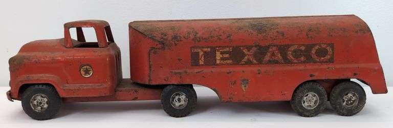 Buddy L pressed steel Texaco tanker truck in original paint with rust. Truck has a bent bumper and grill is missing the drivers side "wing". Truck measures approximately 24 inches long.