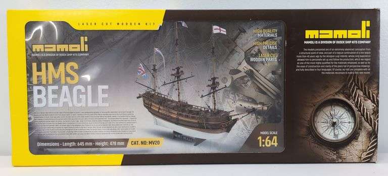 Mamoli HMS Beagle Laser Cut Wooden Ship Kit, Model 1:64 scale, dimensions are 645mm length and 478mm height, Cat No MV20. Un-assembled open box kit appearing complete containing parts in factory sealed packaging with instructions. Box shows some minor edge/corner wear, bright, clean, square and solid.