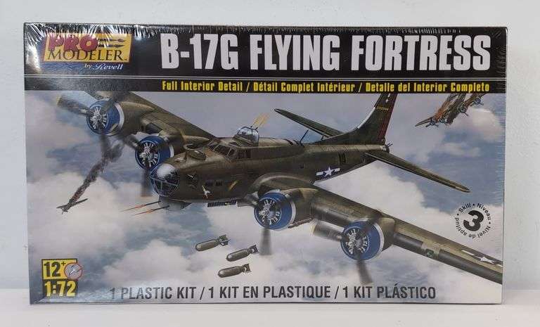 This is a Revell Pro Modeler 1/72 scale model kit of the B-17G Flying Fortress, 85-5861. The kit features detailed interior and exterior components. It is skill level 3, intended for modelers aged 12 and up. Kit is Mint, factory sealed with un-torn factory cellophane overwrap.