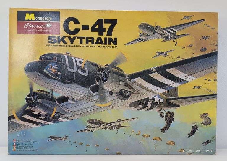 This auction features a Monogram Classics C-47 Skytrain 1/48 scale plastic model kit, 85-5607. Un-assembled open box kit that may or may not be complete. Parts on sprue in bags, loose parts in bag, literature, decals. Kit is missing instruction. Two of the bags have blue Sharpie writing, suggesting this may have been an internal company production sample. Box has some minor warping to lid. Lid is bright, clean, square and solid. Box has no factory stickers.