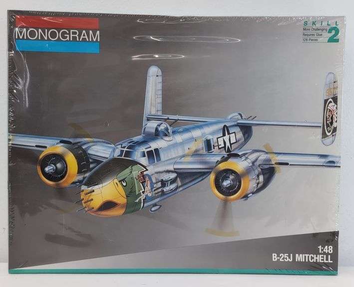 This auction features a sealed Monogram 1:48 scale model kit of a B-25J Mitchell, 5507. The kit includes 128 pieces and requires glue for assembly. Features detailed parts. Skill level 2. Kit is Mint, factory sealed with un-torn cellophane overwrap.