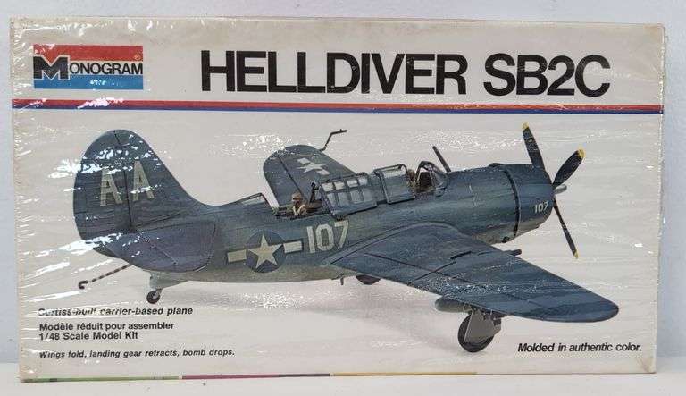 Monogram 1/48 Scale Helldiver SB2C model kit, 6831. Kit is Mint, factory sealed in slightly torn cellophane overwrap. Box shows some minor signs of storage and shelf wear, square and solid.