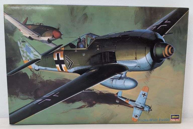 Hasegawa Focke-Wulf FW190 1:32 Scale Model Kit No. ST6:2600 08056. Un-assembled, open box kit, appearing complete containing parts on sprue in factory sealed bag, literature, decals, instructions, etc. Box shows little wear, bright, clean, square and solid.