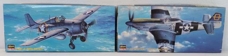 Two Hasegawa 1/72 scale model airplane kits. One is the F4F-4 Wildcat AP24:1200 51324 and the other is the P-51D Mustang 'Jumpin' Jacques' AP20:1200 51320. 51320 is open box, assembled and painted parts, some parts on sprue, instructions, decals, appears ready to complete. 51324 is open box, un-assembled, parts on sprue in factory sealed bags, literature, decals, instructions. Boxes show little wear, bright, clean, square and solid.