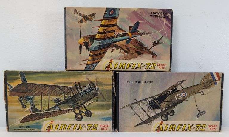 Lot of 3 Airfix 72 scale airplane model kits. Included are the Hawker Typhoon Series 10-39, Bristol Fighter Series 7-39, and 1916 R.E. 8 Series 8-39, model kits. Un-assembled open box kits appearing complete containing parts on sprue, decals, instructions. 8-39 box lid has a partially detached/torn end panel. Boxes otherwise show little to light wear, bright, clean, square and solid.
