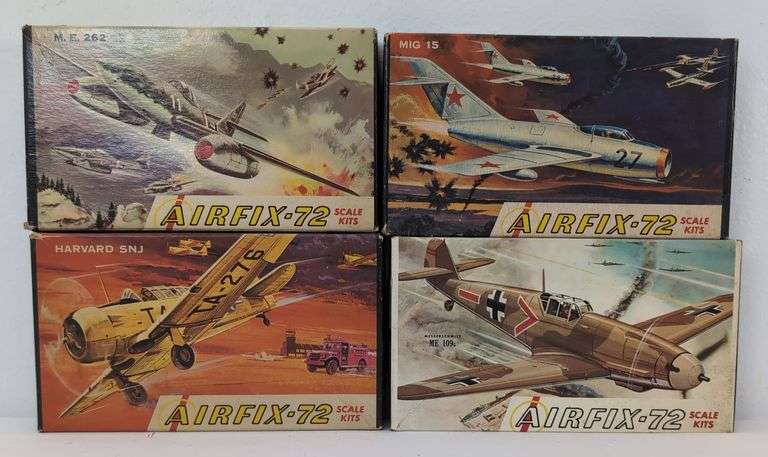 This lot features four Airfix 1/72 scale model kits. The kits include the Messerschmitt ME-109 G Series 4-39, MIG 15 Series 12-39, Harvard SNJ Series 9-39, and M.E. 262 Series 11-39. Open box kits appearing complete containing parts on sprue, loose parts, instructions, literature, decals, etc. Boxes show little wear, bright clean, square and solid.