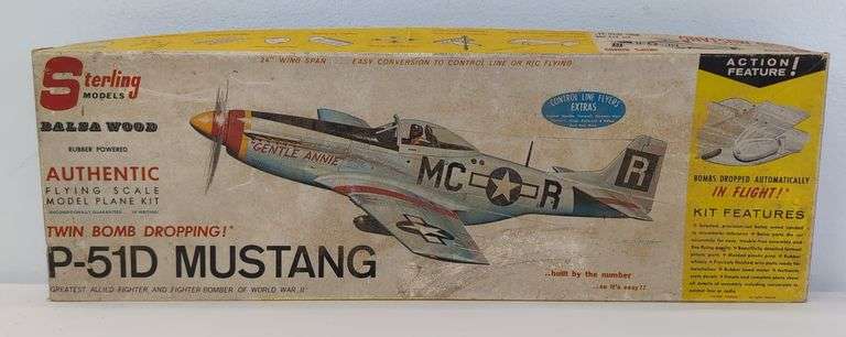 Sterling Models P-51D Mustang Flying Scale Model Plane Kit A13-398. Kit appears to be complete with partially assembly. Included are wooden pieces, decals, engine, cloth and other parts included. No outwardly apparent reason this kit can't be completed. Also included is a small un-marked gas engine with a Top-Flite propellor. Box shows little wear, dust, square and solid.