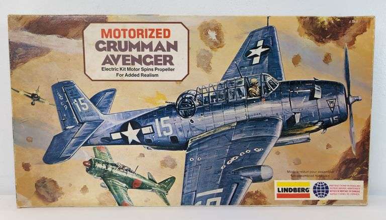 This listing features a Lindberg motorized Grumman Avenger 1/48 scale model kit, Kit No. 2506M. The kit includes parts to build a model of the World War II torpedo bomber. Electric kit motor spins propeller. Un-assembled open box kit appearing complete with parts on sprue in factory sealed bags, loose parts, stand, literature, instructions, decals, etc. Box shows little wear, slightly split lid corner, bright, square and solid.