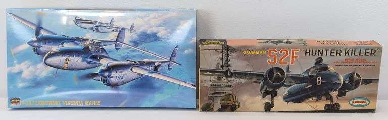 This lot includes two airplane model kits: Hasegawa JT1:3600 1:48 scale P-38J Lightning 'Virginia Marie' and an Aurora Kit No. 145-130 Grumman S2F 'Hunter Killer' model. Aurora kit is un-assembled open box, appearing complete with parts on sprue, instructions, decals. Box shows little wear, bright, clean, square and solid. Hasegawa kit is Mint, factory sealed with un-torn cellophane overwrap.