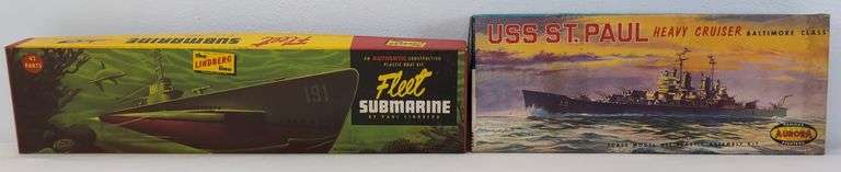 Two Kit No. 703:98 model kits: Lindberg Fleet Submarine and Aurora USS St. Paul Heavy Cruiser Baltimore Class. Un-assembled open box kits appearing complete containing parts on sprue, literature, instructions, decals, etc. Boxes show no wear, bright, clean, square and solid.