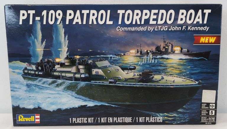 This listing features a Revell PT-109 Patrol Torpedo Boat model kit, scale 1:72 85-0319. This kit includes plastic parts and decals. Commanded by LTJG John F. Kennedy. Included is an Eduard etched accessories pack 53219, open but complete with instructions sheet. Box shows no wear, bright, clean, square and solid.