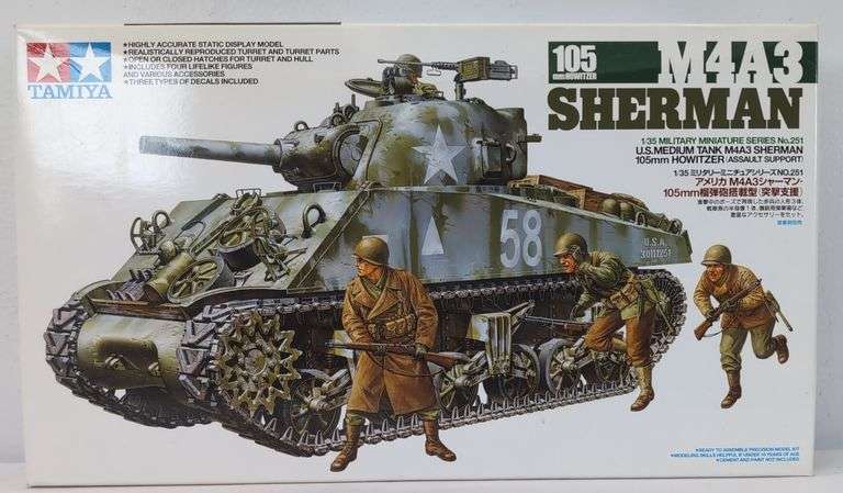 Tamiya 1/35 scale model kit of a M4A3 Sherman 105mm Howitzer tank, item number 35251. Kit is un-assembled open box appearing complete containing parts on sprue in factory sealed bags, tracks, base, literature, instructions, decals, etc. Box shows little wear, bright, clean, square and solid.
