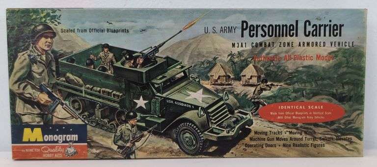 Monogram U.S. Army M3A1 Combat Zone Armored Vehicle Personnel Carrier All-Plastic Scale Model Kit, Plastikit PM34-149. Un-assembled open box kit appearing complete containing parts on sprue, loose parts, literature, instructions, decals, etc. Box shows little wear, bright, clean, square and solid.