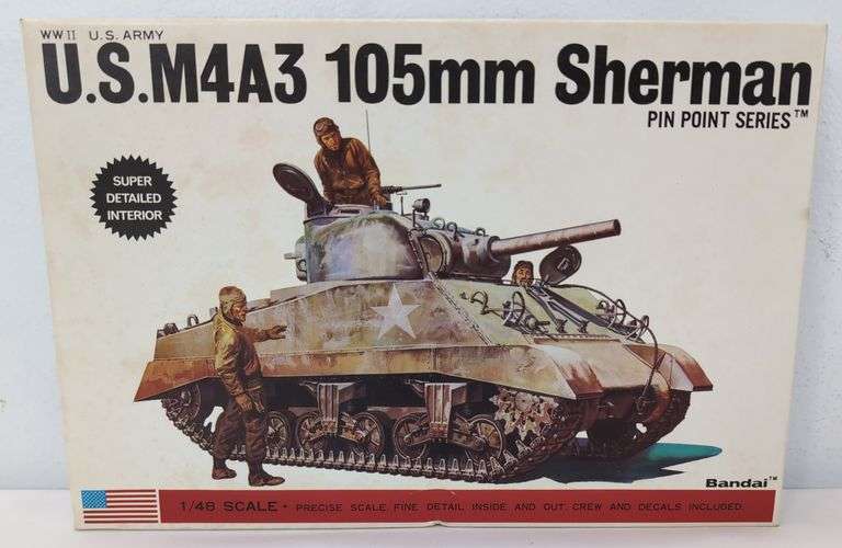 This is a Bandai 1/48 scale model kit of a U.S. M4A3 105mm Sherman Tank, Kit No. 8288. Un-assembled open box kit appearing complete containing parts on sprue in factory sealed bags, literature, instructions, decals, etc. Box shows little wear, bright, clean, square and solid.
