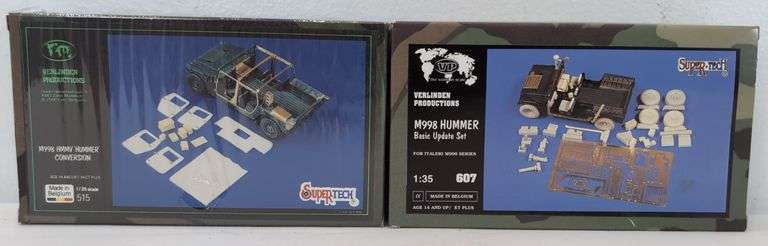This auction is for a lot of two Verlinden Productions 1/35 scale model kits for the M998 Hummer. Includes a basic update set 607 and a conversion kit 515. Open box items appearing complete with un-assembled parts and instructions. Photo-etched parts in Kit 607 appear tarnished. Boxes show little wear.