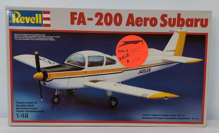 Revell FA-200 Aero Subaru 1/48 scale plastic model kit, No. 4124. Un-assembled open box kit appearing complete containing parts on sprue in bag, literature, instructions, decals, etc. Box is bright, clean, square and solid with price sticker on lid and little wear.