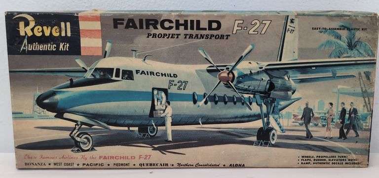 Revell Authentic Kit: Fairchild F-27 Projet Transport model kit, H-297:98. Un-assembled open box kit appearing complete containing parts on sprue in factory sealed bag, instructions, decals, etc. Box lid is slightly faded, clean, square and solid.
