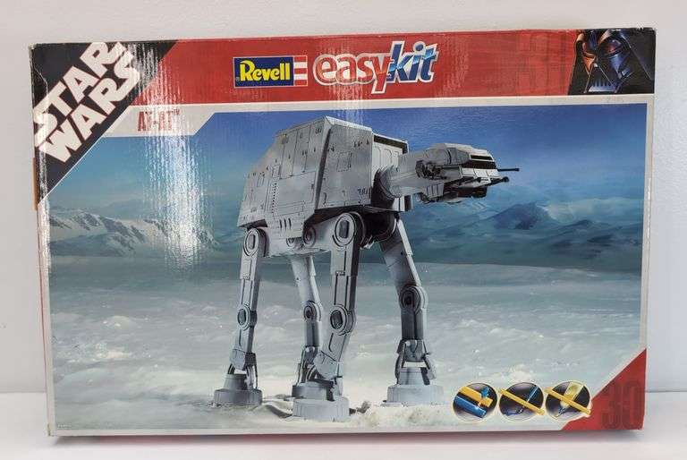 This is a Revell Star Wars AT-AT Easy Kit, 06662. Un-assembled open box kit appearing complete containing parts on sprue in factory sealed bags, instructions, decals, etc. Box shows light wear to open flaps, bright, clean, square and solid.