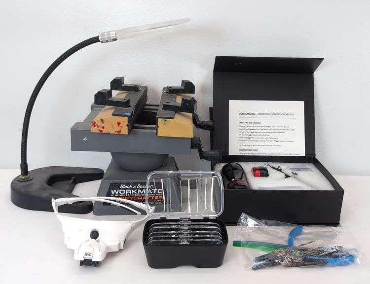 This lot includes a variety of hobby and craft tools. It features a Black & Decker Workmate bench vise that is used with paint on it, but appears to function as intended. A Neat & Handy Airbrush Compressor ARP150 with accessories and manual, which appears to be completely un-used and completely new in original package. A headset magnifier with multiple lenses, that is used but in excellent used condition. Wire nippers, and various alligator clips, with paint on them. Excellent lot for the model kit builder and painter.