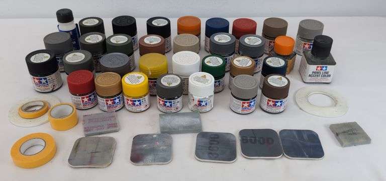 This lot features a variety of Tamiya acrylic paints, Nylon Pin Stripe tape, sanding pads, more. Several bottles of paint were opened, some appeared new, some well used, every bottle had liquid in it. Short inventory of Tamiya paints: X-1, X2, X-4, X-5, X-7, X-8, X-12, X-12, X-13, X-18, X-24, X-26, X-27, X-32. XF-1, XF-2, XF-6, XF-10, XF-11, XF-16, XF-16, XF-19, XF-22, XF-52, XF-53, XF-56, XF-56, XF-57, XF-68. Please view the photos of the items in this lot carefully as they are being sold as they are shown in our photos with NO returns or refunds.
