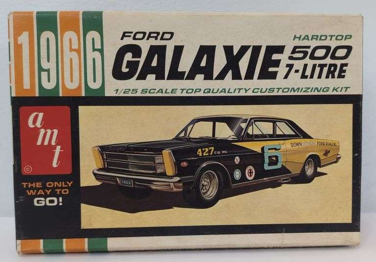 Up for auction is a 1/25 scale AMT model kit of a 1966 Ford Galaxie 500 7-Litre Hardtop 6126-200. Un-assembled open box kit appearing complete with parts on sprue, loose parts, instructions, etc. Box is bright, clean, square and solid with little wear.