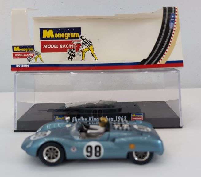 Monogram Revell Shelby King Cobra 1963 Model Racing 1:32 scale slot car, 85-4884. Blue with number 98. Car looks Near Mint/Mint with no track time, decent original package (sleeve has tear). Car is missing the original wire tie-downs.