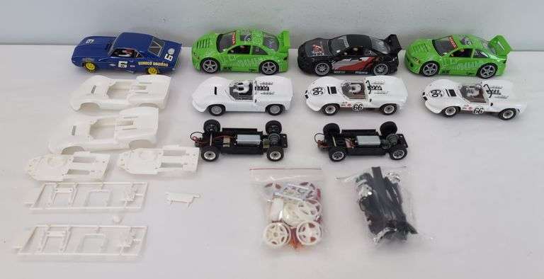 This lot features several slot cars. Included are a Chevrolet Camaro #6, two COX Chaparral #66s, one un-decorated Chaparral, one un-assembled and two undecorated Chaparral and two Honda Eclipse vehicles. The lot also contains various parts and chassis components on factory spure