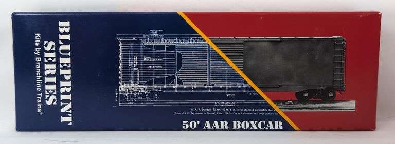 HO scale model train car from Branchline Trains Blueprint Series, 1101 50' AAR boxcar in Chesapeake & Ohio livery. Car #28319, built 1955. Double door design. Kit is unassembled C9-10. Box shows no wear.
