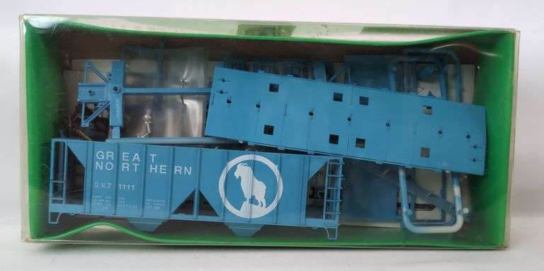 Bowser HO Scale No. 55679 Great Northern 70 Ton 2 Bay Covered Hopper Model Train Car road number GN 71111. Blue body, includes McHenry KS Couplers. Kit is complete and unassembled Mint C10 in factory sealed original box. Box shows some age/warping.