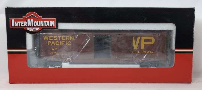 InterMountain Railway Co. HO Scale No. 45614-05 Western Pacific 50' double door boxcar, WP car number 35743 in original box. Train looks un-run C9-10. Box shows no wear.