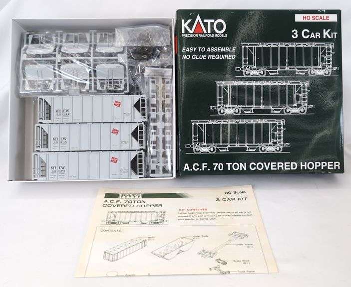 Kato HO Scale No. 38-0108 A.C.F. 70 Ton Covered Hopper 3 Car Kit. Milwaukee Road, new in open box. Complete and unassembled with parts on sprue in factory sealed packages Mint C10. Road numbers 99142, 99208 and 99073. Box shows no wear.