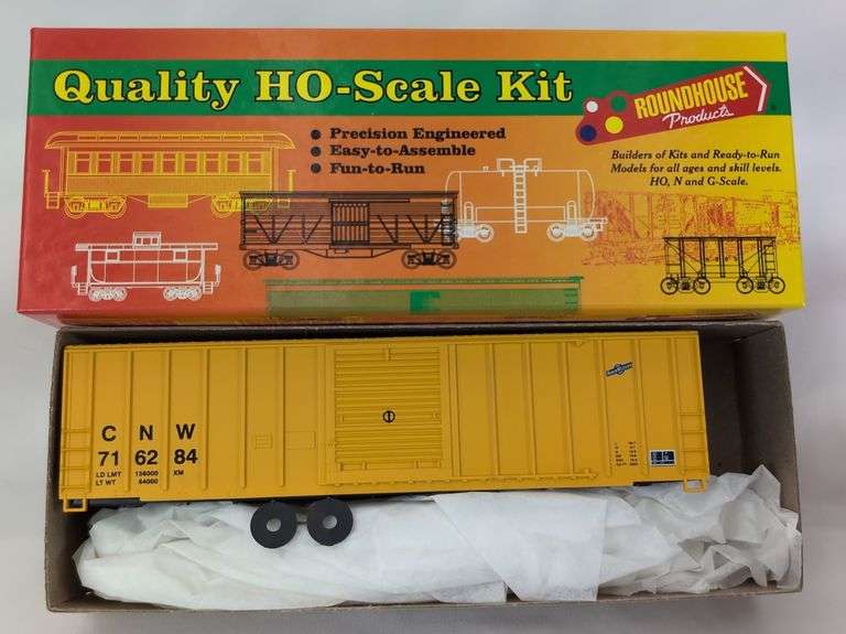 Roundhouse HO-Scale Kit No. 19503 Chicago and North Western 50' FMC single-door box car C&NW 716284, complete and unassembled C9-10 in original box. Box shows little wear.