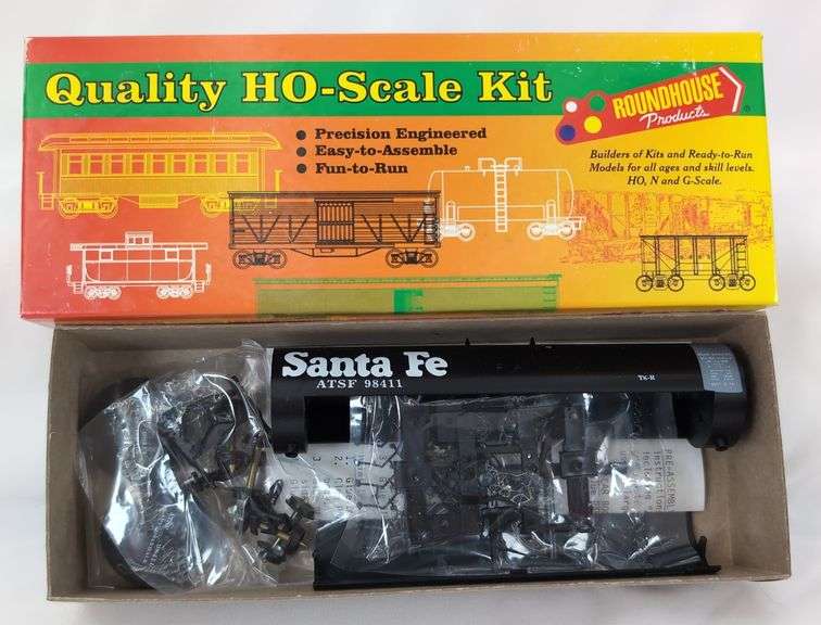 Roundhouse Products Quality HO Scale Kit 01372 Santa Fe 50' Tank Car Model Kit, ATSF 98411. The kit is Precision Engineered, Easy-to-Assemble, and Fun-to-Run. Kit is complete and unassembled C9-10 in original box. Box shows little wear.