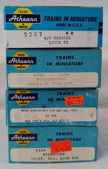 Four Athearn HO scale train car kits. Includes 5367 W/V caboose Santa Fe ATSF 999538 unassembled, 1549 Undecorated chemical tank car unassembled, 539 Marinette, Tomahawk & Western ACF boxcar MTW 4206 unassembled and 1330 Milwaukee 50-Ft. plug door box car MILW 2636 assembled. Assembled train looks C9-10 little if any run time. Others are complete and unassembled C9-10. Boxes show little wear.