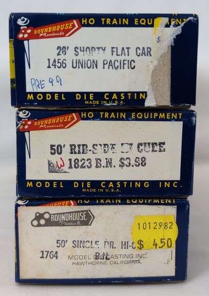 Roundhouse Products HO scale train cars. 1456 26' shorty flat car Union Pacific 7007, 1823 50' rib-side railcar Burlington Northern 320174 and 1764 50' single door Hi-Cube 748856, in original boxes. Kits are unassembled and complete with unattached trim, parts and literature, C9-10. Boxes are square and solid.