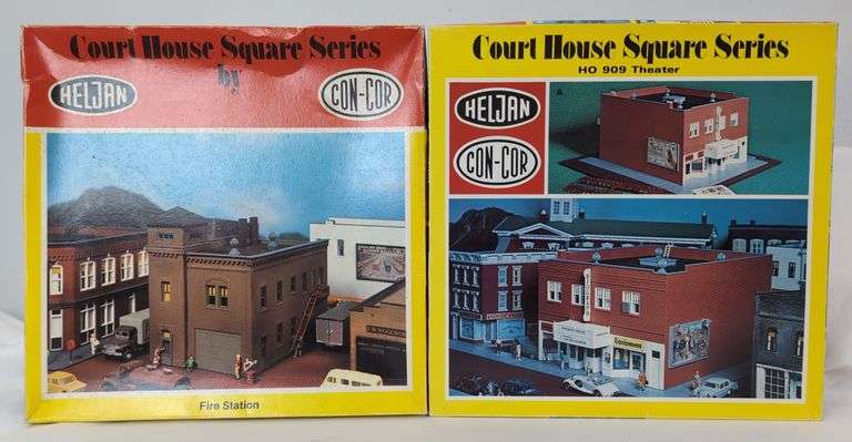 Two Heljan CON-COR 'Court House Square Series' model kits. One is the B 905 Fire Station, and the other is the 909 Theater. Both are HO Scale and are open box kits appearing to be complete and unassembled with parts on sprue, literature included C9-10. Box shows little wear.