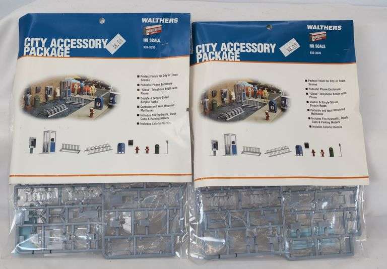 Two sealed Walthers City Accessory Package model kits in HO scale, 933-3535. Each package includes pieces to build accessories like telephone booths, bicycle racks, mailboxes, fire hydrants, trash cans, and parking meters. Both kits have parts on sprue in factory sealed original packages, Mint C10. Packaging shows some light age/wear.