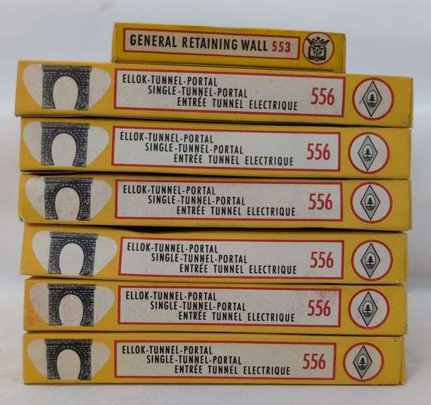 Six Gebr. Faller Ellok Tunnel Portal model railroad kits in original boxes (556), single-tunnel portal entree tunnel electrique HO scale, and one Aristo Craft General Retaining Wall Set (553) with beautifully detailed sturdy plastic pieces, New and unused C9-10. Boxes show little wear.
