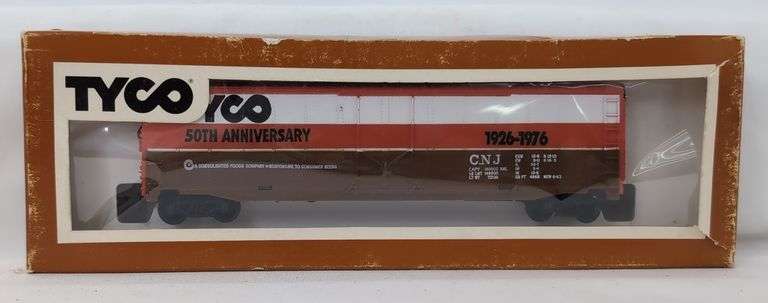 Tyco 50th Anniversary Box Car, 40 foot plug door HO Scale Model Train no. 364 in original box, un-run C9-10. Box shows some light wear and tear to display window, price sticker. Box is square and solid.