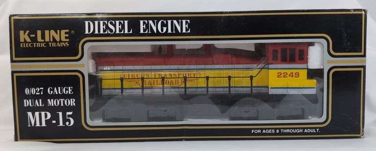 K-Line O Gauge K-2249 Circus Transport Railway MP-15 diesel locomotive in original box, perfect C8 with run time. Box shows minor wear, excellent styrofoam with minor chipping at wheels. Box is bright, clean, square and solid.