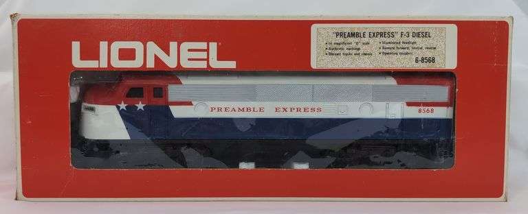 Lionel O Gauge 8568 "Preamble Express" F3a diesel locomotive in box. Train has a strip of missing/flaked paint in the channel of a roof panel edge. White is whiter than normal, but does have some very light signs of age and handling. Train looks lower C7 with very light run time. Box shows very light shelf wear to surface, bright, clean, square and solid. Excellent styrofoam.