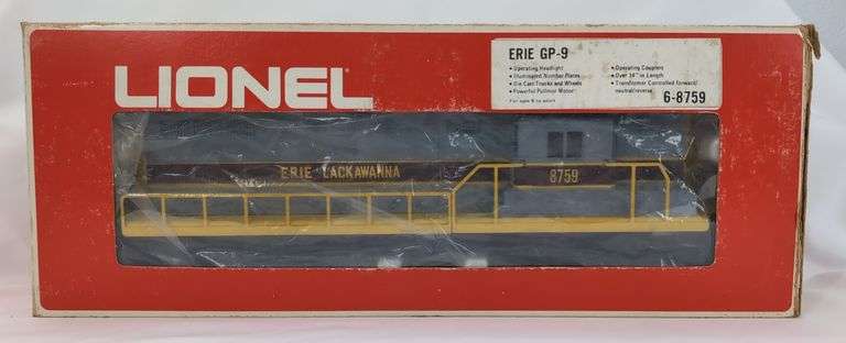 Lionel O Gauge 8759 Erie GP-9 diesel locomotive in original box with instructions, perfect C8 with light run time. Box has a detached end flap, minor age and surface wear starting to show at some corners and edges. Box is otherwise fairly bright, clean, square and solid.