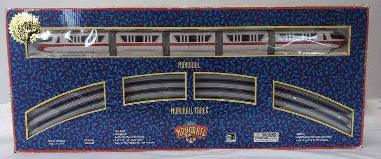 Walt Disney World SKU #12700052 Monorail Mark VI Red Stripe Monorail with some papers that state this unit has been fully restored and has had upgrades to the motor performed in original box with track and instructions. Track shows little sign of having been assembled. Train appears to be C8 with very little evidence of having been ran. Styrofoam is excellent. Box shows light storage wear to ends and some corners/edges. Box is fairly clean, square and solid. Plastic handle appears to have never been used. Papers state: "This is a fully restored Genuine Disney Mark VI (Original Version) Red Stripe Monorail Playset circa 1999 that has been customized with a high speed Kysan Electronics Motor with 3 times the original motor speed at 16,000 RPM's and a 9 volt battery (included) operated caboose beacon light. This Monorail Playset has been long retired and is hard to find in this condition. Restored Monorail Playsets are lightly used, inspected and repaired where necessary. Next the train and track set is cleaned and train cars are polished with a Carnauba based wax front to rear. We do not make any touch up paint repairs. This original version Monorail has black windows, green LED head lights, flashing front and rear LED beacon lights and original authentic Walt Disney World Monorail announcements sounds."